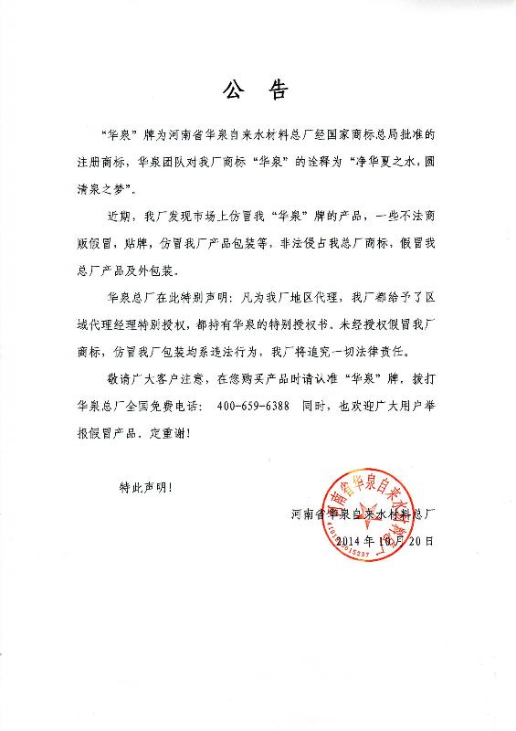 “華泉”牌聚合氯化鋁假冒商標(biāo)公告