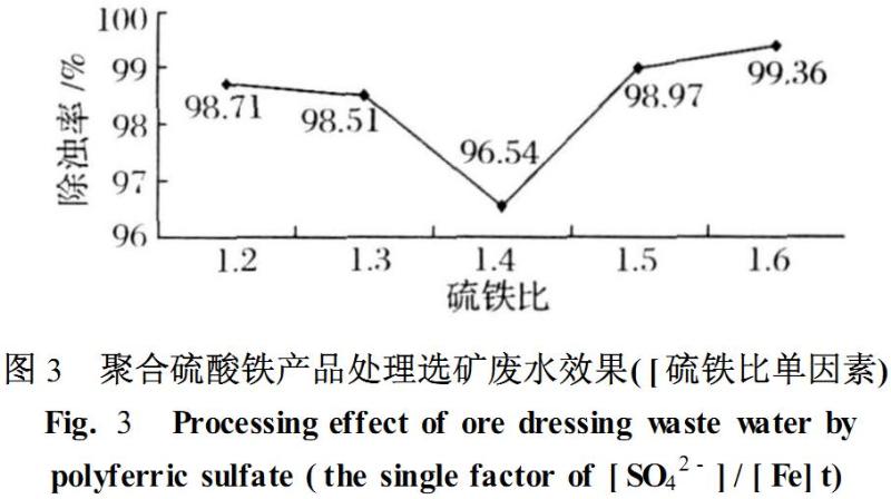 制備聚合硫酸鐵實驗中硫鐵比單因素實驗。在其他因素相同情況下調節(jié)不同的硫鐵比([SO42-]/[Fe]t)制備一系列的聚合硫酸鐵,而后測定其處理選礦廢水的性能,數(shù)據(jù)見圖3.