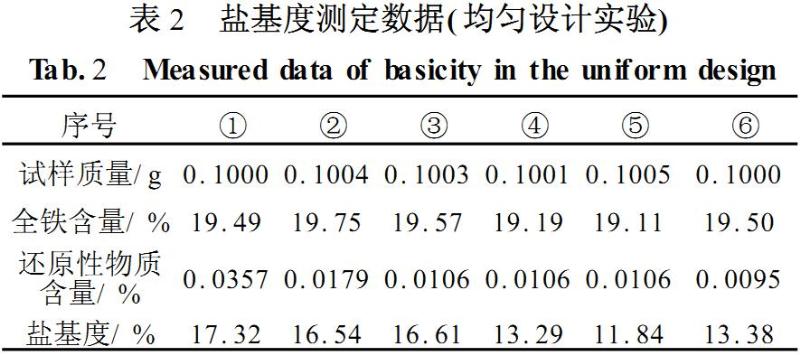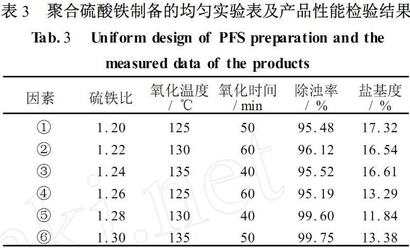 根據(jù)聚合硫酸鐵單因素實(shí)驗(yàn)分析的結(jié)果,選取硫鐵比、反應(yīng)溫度、氧化時(shí)間這三個(gè)因素的各個(gè)水平,然后選擇適宜的均勻設(shè)計(jì)表進(jìn)行實(shí)驗(yàn)(見表3).