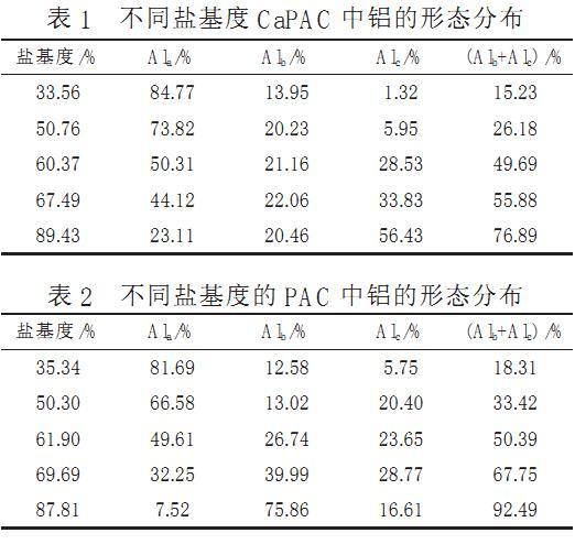 由表1和表2鋁形態(tài)分布與鹽基度關(guān)系可知當(dāng)制備聚合氯化鋁混凝劑時(shí),由于所采用的原料和工藝方法不同,當(dāng)鹽基度逐漸升高時(shí),并不是所有樣品中的Alc都一直升高,在PAC和CaPAC中,Alb和Alc隨鹽基度的變化規(guī)律并不是完全相同