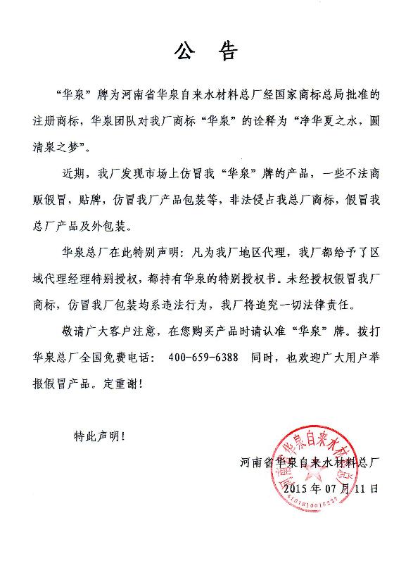 關(guān)于市場上聚合氯化鋁產(chǎn)品假冒“華泉”商標(biāo)現(xiàn)象說明公告