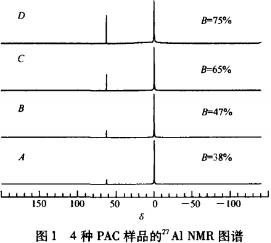 將實(shí)驗(yàn)室制備的4種聚合氯化鋁樣品全部稀釋為0.1 mol/L,用核磁共振儀進(jìn)行測(cè)試。采用德國(guó)Bruker公司的DSX-300型核磁共振儀,共振頻率為78.2 MHz.翻轉(zhuǎn)角為100.2次采樣時(shí)間間隔1s.以Al( H20)6+CI3為化學(xué)位移的參考定義6.0。