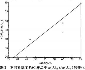 聚合氯化鋁樣品27 Al NMR測(cè)試的綜合圖譜見(jiàn)圖1。在6.0和6.63處,分別有1個(gè)共振峰,代表八面體單聚物Al(H:O)f“和A1.,的s.[Al13O4(OH) 24(H:O).:]7+四面體成分。具有Keggin形態(tài)結(jié)構(gòu)的聚陽(yáng)離子Al13的結(jié)構(gòu)中心為四面體Al0.,外圍是12個(gè)鋁八面體,但是其八面體部分由于信號(hào)過(guò)寬在27 Al NMR圖譜中很難顯示。因此,6.63處的共振峰代表Al13聚合陽(yáng)離子組分的十三分之一。圖1顯示4種PAC樣品隨著鹽基度的升高,6.63處的峰逐漸增強(qiáng),即鹽基度或堿化度B(羥基與3倍鋁離子的摩爾比)增高,Al13,的相對(duì)含量逐漸增大。這一趨勢(shì)與已有的文獻(xiàn)報(bào)道相一致。根據(jù)共振峰的積分面積計(jì)算,可得出不同鹽基度PAC樣品中Al13的相對(duì)含量,并且,n(Al13)/n(Alm)的值與鹽基度呈線性相關(guān),變化趨勢(shì)如圖2所示。但是,27 Al NMR測(cè)試也存在較明顯的缺點(diǎn)。在較低的磁場(chǎng)強(qiáng)度下,某些鋁形態(tài)無(wú)法被檢測(cè)。由于配位對(duì)稱性較差,鋁核有較大的四級(jí)耦合常數(shù),信號(hào)可能過(guò)寬而不能被檢測(cè)。在本實(shí)驗(yàn)中,只檢測(cè)到單聚體鋁和Al13結(jié)構(gòu)中心四面體這2個(gè)共振峰,而總鋁中的某些部分,如一些低聚物,比Al13更高聚合態(tài)的鋁離子,有研究人員發(fā)現(xiàn)的Al30等形態(tài)都未能檢出。這可能與聚合氯化鋁樣品的制備與處理方法和實(shí)驗(yàn)條件有關(guān)。